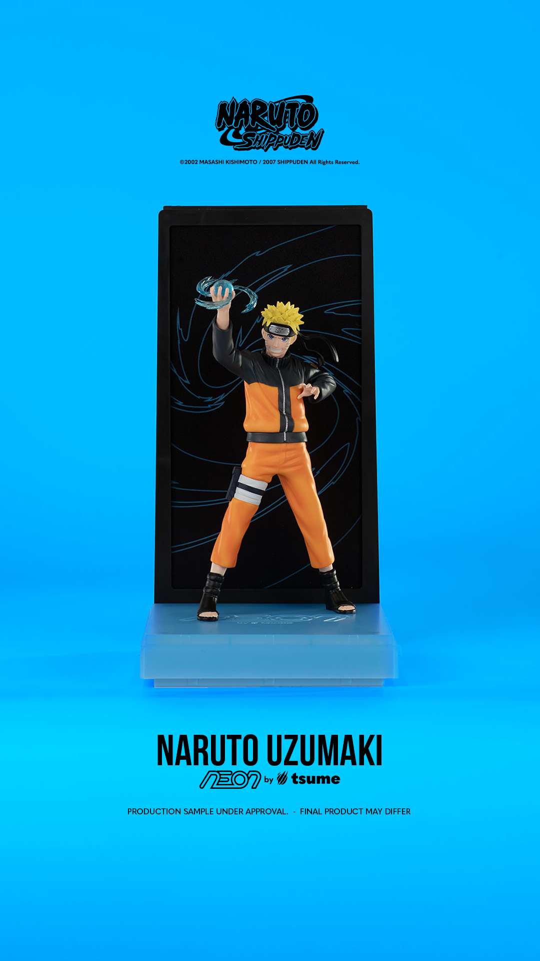 Naruto est représenté dans sa tenue iconique de Naruto Shippuden, prêt à lancer son attaque signature : Le Rasengan ! Son attitude traduit la force de caractère qui définit le ninja de Konoha dans chacun de ses combats. Le Rasengan de Naruto prend vie dans le background, prolongeant visuellement la puissance de l’attaque et donnant à la scène une intensité lumineuse saisissante.